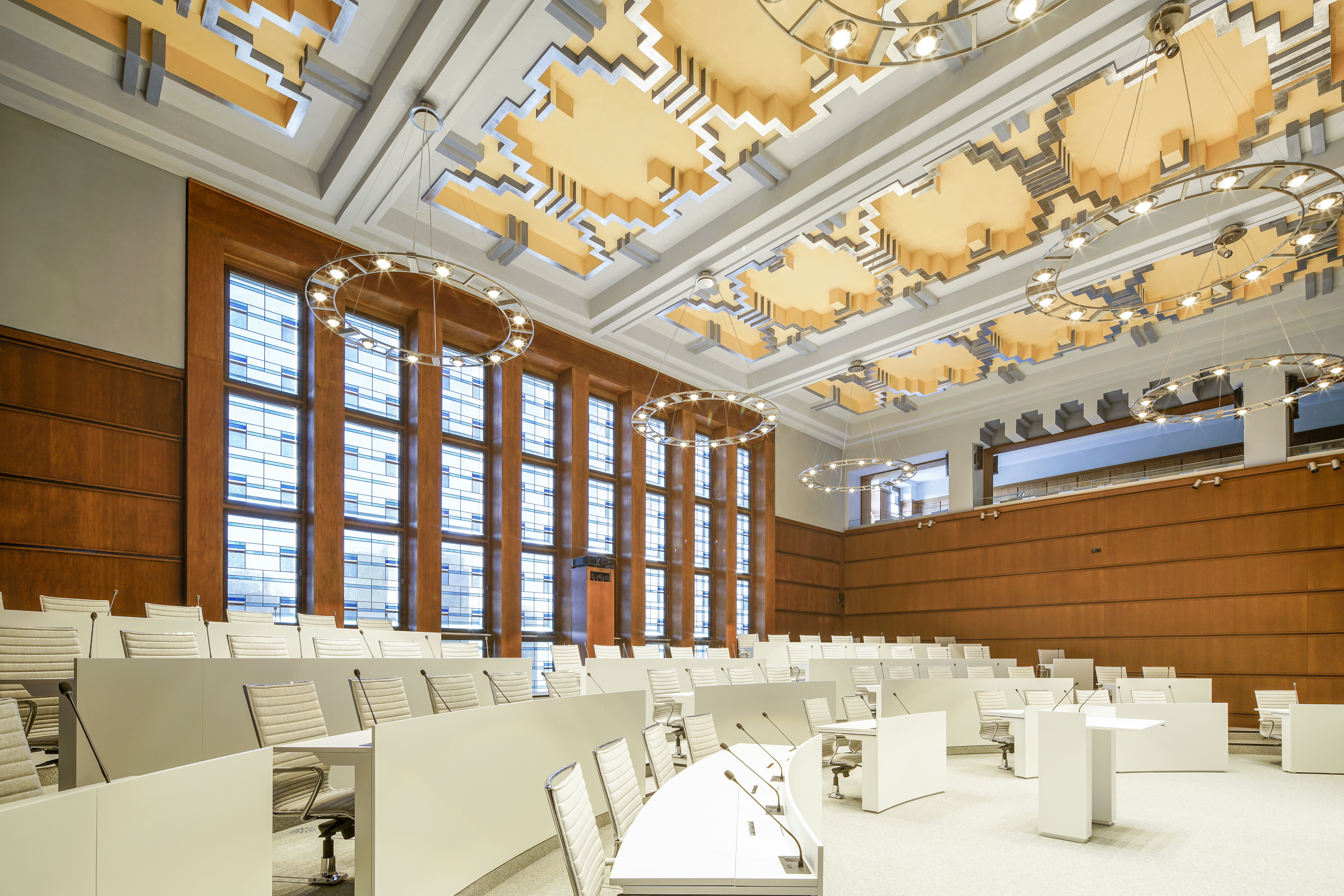Der Ratssaal des Rathauses in Oberhausen soll barrierefrei gestaltet werden, sodass er auch für geh-, seh- und hörbeeinträchtigte Menschen zugänglich und nutzbar wird. In diesem Rahmen soll auch die Medien-, Lüftungs- und Beschallungstechnik modernisiert werden sowie die gesamte Möblierung und sämtliche Oberflächen erneuert werden.